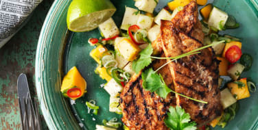 Servera kycklingen med mango salsa och nagra limeklyftor och koriander kvistar. Mangosalsan aer alltid ett saekert kort och med ingredienser som goer gott i kroppen. Passar perfekt aeven till grillat fisk eller kyckling.